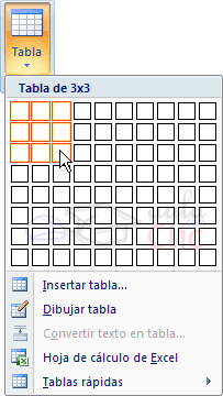 ) y aparecerá un menú que te permitirá ver de cuantas columnas (vea glosario) y cuantas filas (también ver el glosario) vas a insertar. Debajo de los cuadros puedes ver la dimensión de la tabla